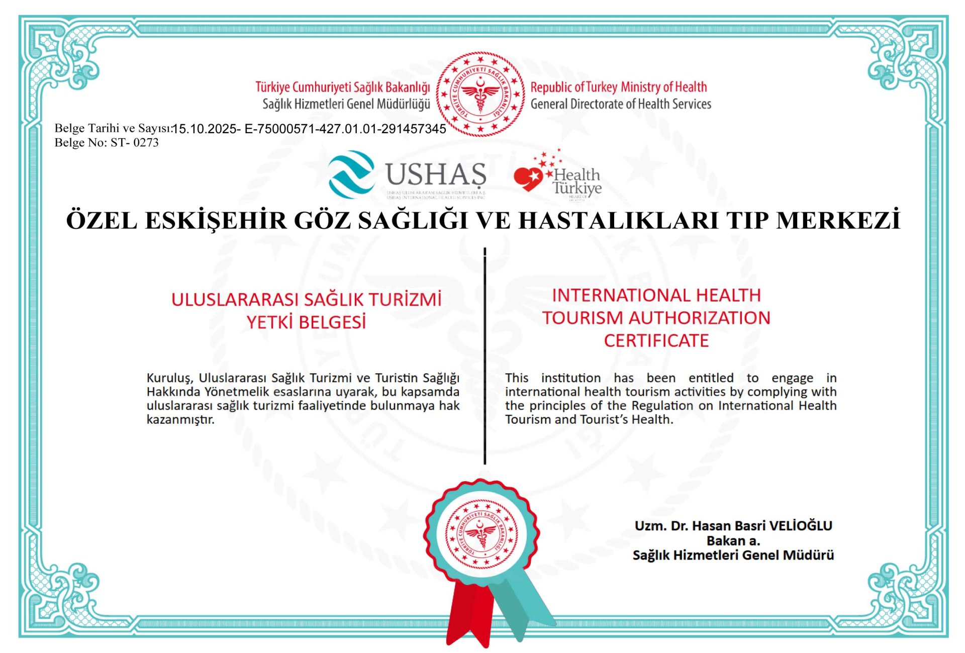 Uluslararası Sağlık Turizmi ve Turist Sağlığı Yönetmeliği 13 Temmuz 2017 tarihinde yürürlüğe girmiş ve sağlık turizmi yapabilmek için yetki belgesine sahip olmak zorunlu kılınmıştır. Denetim ve değerlendirme Türkiye Cumhuriyeti Sağlık Bakanlığı tarafından yapılmaktadır. Belgemiz aşağıdaki bağlantıdan doğrulanabilmektedir.