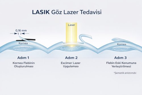 LASIK açılımı Laser in-Situ Keratomileusis demektir. Korneanın üst yüzeyinden keratom denilen bir cihaz aracılığı ile 90-130 mikron kalınlıkta yuvarlak ince bir tabaka kesilir. Bu tabakaya flep denir. Özel bir durum yok işe çoğunlukla 90 mikron kalınlıkta ince bir tabaka kesilir. Kesi sırasında ağrı oluşmaz. Düşük düzeyde yanma hissi olabilir. Flep kaldırılı ve alttaki Kornea Excimer Laser uygulanır. Daha sonra Kornea üzerine yara bandı gören 0 numara bandaj kontak lens konur. Yara bandı görevi görür. Yaklaşık kontak lens 1-2 gün gözde kalır. Daha sonra alınır. Bu süre içeresinde Flep tabakası bir yerine yapışır. Flep eski yerine kendiliğinden doğal yapışma özelliği olduğundan bu operasyonlarda fleb’e dikiş konulmaz. Ancak Gözü ovuşturmamak gerekir. Aksi halde Flep buruşur. Tekrar düzeltilebilir. Ancak ikinci bir işe ve stres olacaktır.
