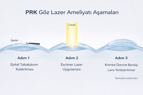 PRK’nın açılımı Photorefraktif Keratektomidir. İlk kullanılan yöntemdir. Korneanın en üstünü/yüzeyini epitel olarak adlandırılan kaldırım taşı gibi birkaç kat hücreden oluşan ince tabaka kaplar. PRK bu tabaka bir cerrahi alet ile sıyrılarak, kırma kusurunu yani gözlük ihtiyacını düzeltmek için alttaki yatak dokuya Excimer Laser uygulanır. Daha sonra Kornea üzerine yara bandı gören 0 numara bandaj kontak lens konur. Yara bandı görevi görür. Yaklaşık kontak lens 3-4 gün gözde kalır. Daha sonra alınır. Bu süre içeresinde epitel tabakası kendini yeniler ve kapanır.